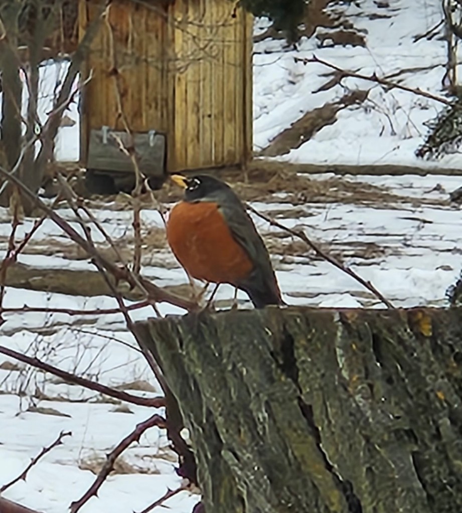 The robins have returned unaware of the snow dump and deep freeze that would welcome them back to Wisconsin. I watched one perched high on a tree. It seemed he was trying to catch a bit of sun that was beginning to break the darkness. Feathers puffed, I wondered if we shared the same bewilderment of a world gone mad. I took birdseed and water to their haunts, hoping to help them ward off the bitterness, and realizing I was helping myself as well.
